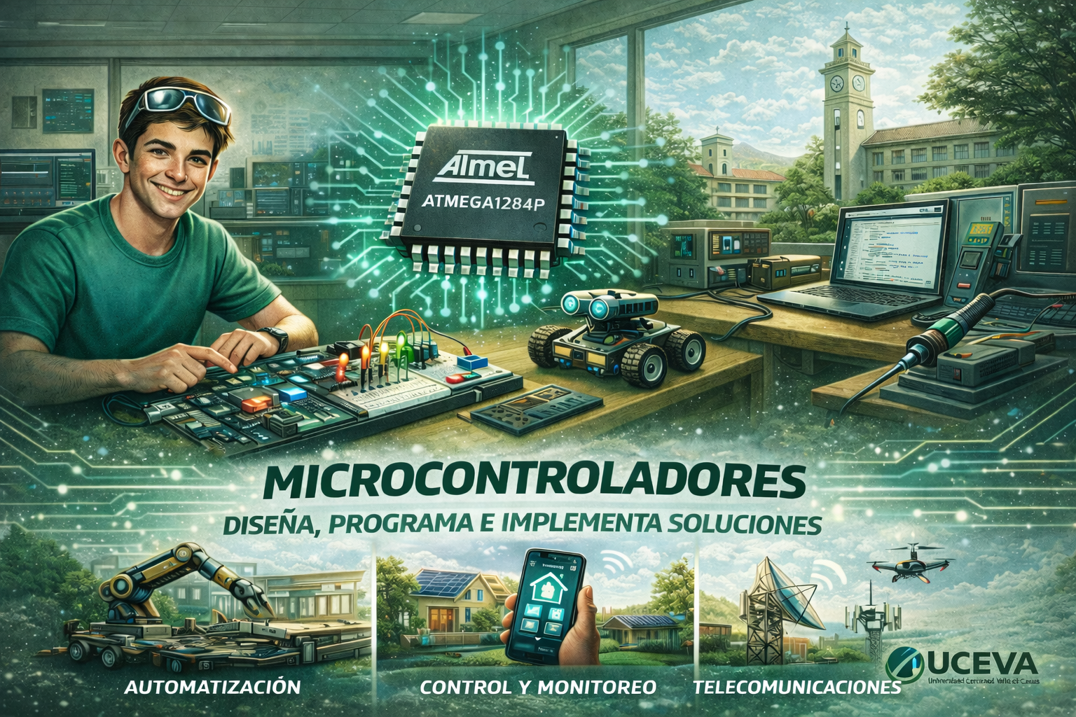 La asignatura Microcontroladores introduce al estudiante en los fundamentos teóricos y prácticos de los sistemas microcontrolados, con énfasis en el diseño, programación e implementación de soluciones reales para aplicaciones en automatización, control y telecomunicaciones.